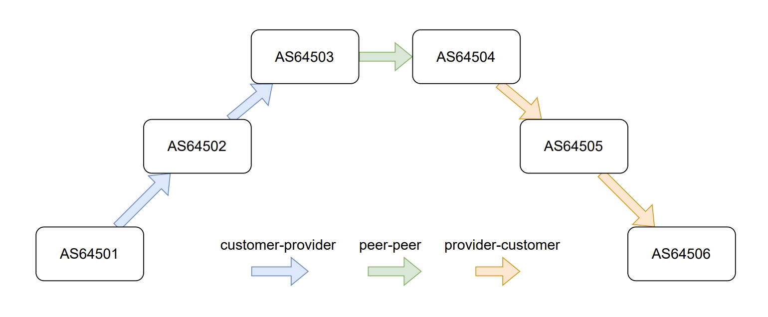 To detect an illegitimate detour, ASPA relies on the natural hierarchy of the Internet. In healthy routing, traffic travels “up” through increasingly large providers, optionally crosses a single peering link at the top, then flows “down” to the destination. This is the so-called “mountain” or “valley-free” shape: