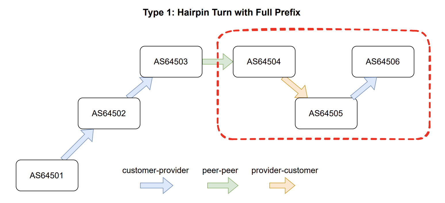 A route leak creates a “valley”: traffic descends to a customer AS and then unexpectedly travels back up to another provider. ASPA detects precisely this down-then-up movement by verifying that both ends of the path meet at the top: